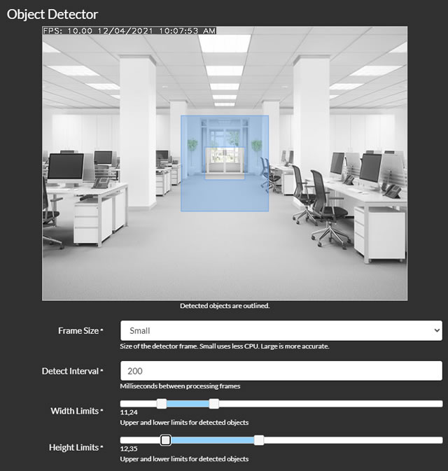 • Width Limits and Height Limits: Define the size range of objects for Agent DVR to detect, expressed as a percentage of the frame's width or height. Adjusting these sliders will display an overlay on the video, indicating the size range of objects being targeted.