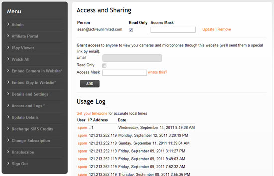 iSpyConnect allows you to share access to your cameras and microphones with friends, family, customers or co-workers (subscribers only). To give someone else access click on the "Access and Logs" link on the left hand menu. When you give someone access to iSpy we send them a special link by email. You can grant them full access (they are able to switch on/off, record, delete etc) or read-only access and you can revoke access at any time through the same page.