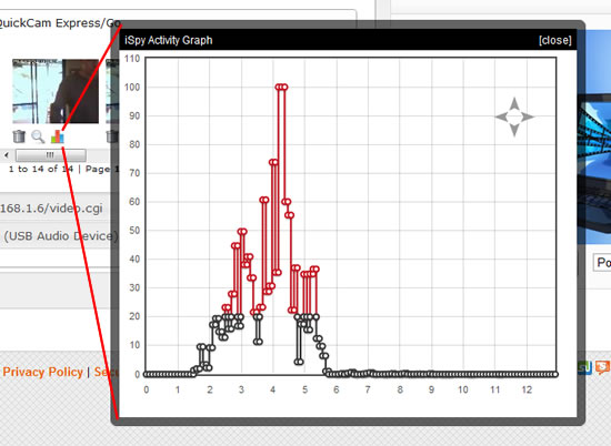 iSpy keeps track of the activity detected during recording and exposes this information in activity graphs. These graphs are available on a per-recording or based on the full list of files that result from your search criteria. The red points indicate motion that falls above the motion triggee and the black is motion that isn't enough to trigger the motion detector.