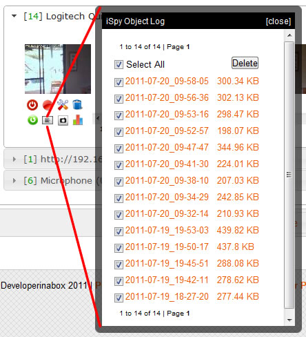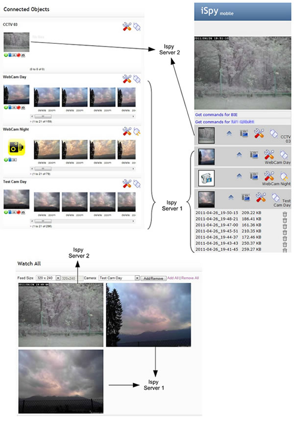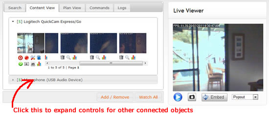 You can access content or live feeds from other cameras and microphones by expanding the panel for that object. To conserve space, processing power and bandwidth iSpyConnect displays content for one object at a time.