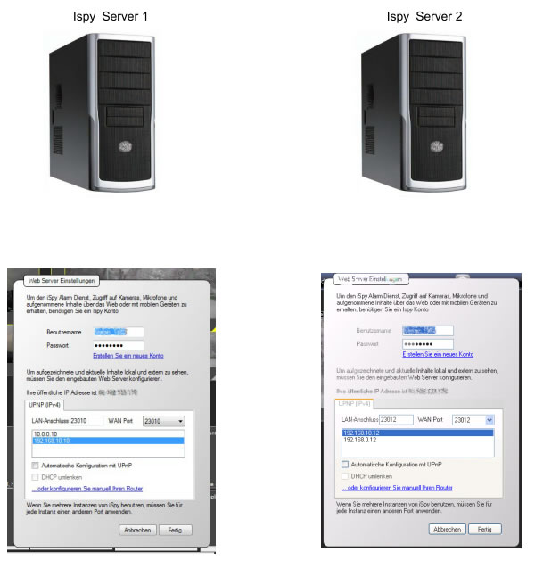 With one iSpy account you can access and control cameras and microphones on multiple computers Use the same login details for each computer and just specify a different port. All connected cameras and microphones will be fully accessible from our website as long as your router is setup to forward those ports to the relevant computers on your network. You may for example setup 2 ispy servers, one at home and one at work. You can then access live and recorded content from both anywhere in the world via this website.
