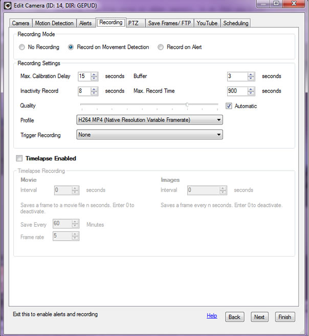 - Inactivity Record: The number of seconds to continue recording after motion is no longer detected. With a low value you may get lots of seperate clips. With a higher value you will get fewer clips but longer periods of inactivity recorded.