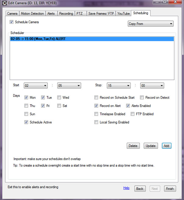 iSpy includes a scheduler which allows you to configure recording, detecting, alerting and timelapse settings changes throughout the week.