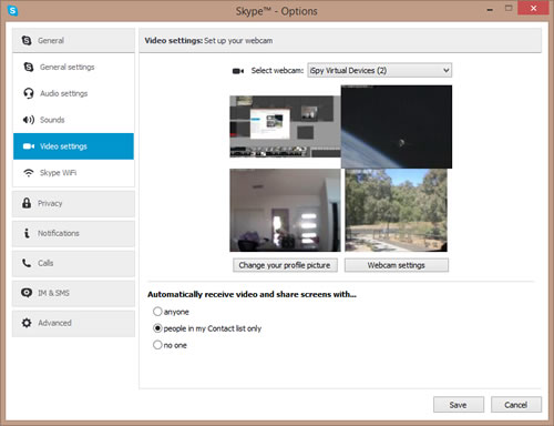 - Select "iSpy Virtual Devices" in the webcam dropdown (if you don't see this run the install.bat file again and check it is installing successfully. You will need Administrator privileges to install this. Try restarting skype and restarting your PC)
