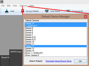 To setup default cameras, open ispy and click "Options - Default Device Manager". You can then select 1 or more cameras to display in the default video feed to the virtual device driver.